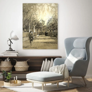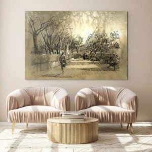Tablou pe sticlă - Un desen al unui parc cu alei și oameni care se plimbă - 70x50cm - Un moment reținut cu pene - Decorațiune modernă pentru perete pentru living și dormitor ARTTOR