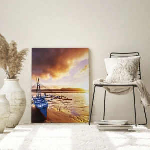 - Un tablou pitoresc reprezentând o barcă pe o plajă la apus. Cerul dramatic și culorile calde creează o atmosferă romantică și exotică, perfectă pentru decorarea interioară.