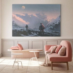 • Acest tablou înfățișează astronauți pe o planetă extraterestră, cu o epavă pe fundalul unor munți. Un decor fantastic plin de mister și inspirație, perfect pentru interioarele moderne.