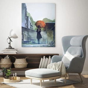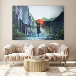 Tablou pe sticlă - figură cu o umbrelă portocalie pe o stradă ploioasă - 70x50cm - Ploaie revitalizantă - Decorațiune modernă pentru perete pentru living și dormitor ARTTOR