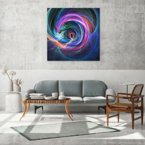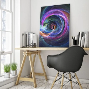 Această imprimare abstractă pe sticlă, cu o spirală dinamică în culori intense, este o operă de artă care atrage atenția și aduce o energie unică interiorului. Nuanțele profunde de violet, roz și albastru se împletesc, creând un efect fascinant ce oferă o experiență vizuală de neuitat.