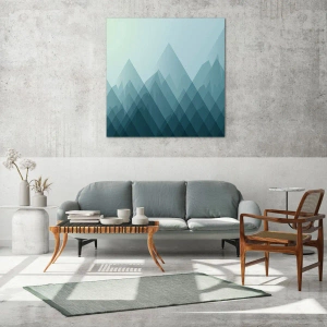 Tablou pe sticlă - Munți stratificați abstracti în nuanțe delicate de albastru - 70x50cm - Mare, mai mare, cea mai mare - Decorațiune modernă pentru perete pentru living și dormitor ARTTOR