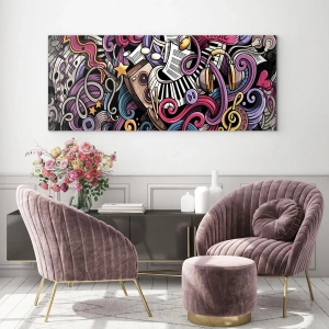 Tablou pe sticlă - Teme muzicale colorate cu note și instrumente - 70x50cm - Melodie complicată - Decorațiune modernă pentru perete pentru living și dormitor ARTTOR