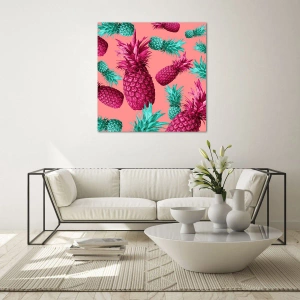 - Acest print pe sticlă înfățișează ananas colorat în nuanțe vibrante de roz și verde pe un fundal roz. Un plus perfect pentru interioarele moderne.