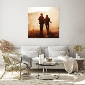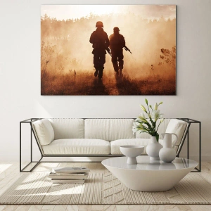 Această piesă de artă se potrivește perfect în interioarele industriale, moderne sau în stil loft. Contrastul dintre lumina caldă a soarelui care apune și siluetele soldaților creează un efect vizual uimitor care atrage atenția și inspiră. Este alegerea perfectă pentru cei care doresc să-și exprime pasiunea pentru teme militare sau apreciază decorațiunile murale îndrăznețe.