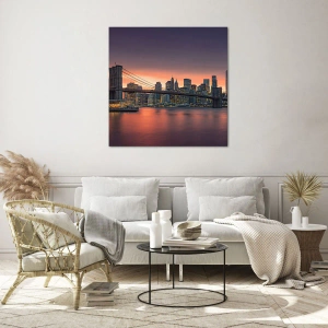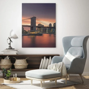 Tablou pe sticlă - Podul Brooklyn la apus - 70x50cm - Scufundate în tăcerea liliachie - Decorațiune modernă pentru perete pentru living și dormitor ARTTOR