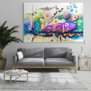 • Pictura de 70x50 cm înfățișează o compoziție abstractă cu culori vii, forme geometrice și linii delicate, ideală ca decor pentru un interior modern.