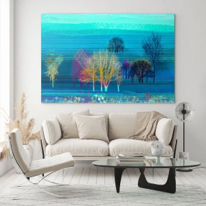Tablou pe sticlă - Un peisaj colorat cu copaci pe un fundal de tonuri albastre - 70x50cm - Un peisaj pieptănat - Decorațiune modernă pentru perete pentru living și dormitor ARTTOR