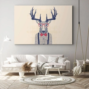 Tapet pe pânză „Cerb stilizat cu ochelari și papion” este o lucrare unică ce combină umorul cu eleganța. Reprezintă un cerb purtând ochelari roșii și un papion elegant cu buline, ceea ce conferă tabloului un caracter original și la modă. Detalii subtile, precum cămașa în carouri și bretelele, subliniază individualitatea și creativitatea designului.