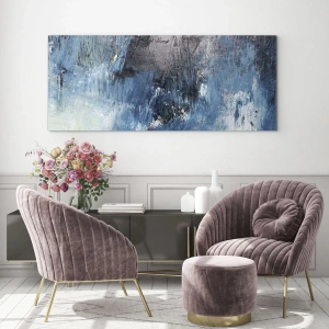 Abstracție dinamică în nuanțe de albastru, prezentând un joc intens de texturi și culori. Perfectă pentru interioare moderne, introducând o notă de expresie artistică.