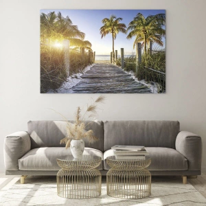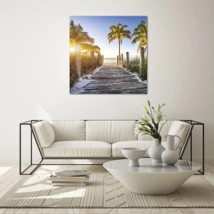 Tablou pe sticlă - Alee de lemn pe plajă înconjurată de palmieri - 70x50cm - Direct în paradis - Decorațiune modernă pentru perete pentru living și dormitor ARTTOR