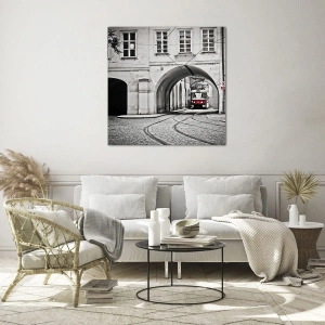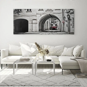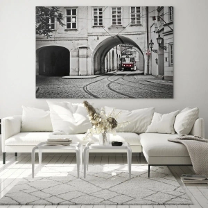 Tablou pe sticlă - Tramvai alb-negru pe o stradă veche - 70x50cm - Printr-un labirint urban - Decorațiune modernă pentru perete pentru living și dormitor ARTTOR
