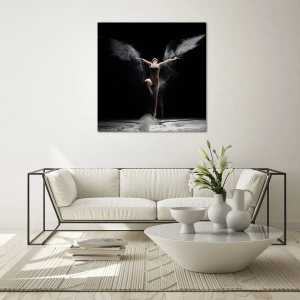 Tablou pe sticlă - O dansatoare în nori de pudră pe un fundal negru - 70x50cm - Elfii există - Decorațiune modernă pentru perete pentru living și dormitor ARTTOR