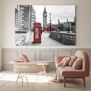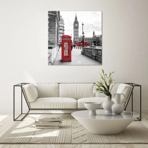 Culorile alb-negru subliniază eleganța și caracterul atemporal al peisajului londonez, în timp ce elementele roșii adaugă expresivitate. Este decorul perfect pentru iubitorii de stil urban, motive clasice și cultură britanică.
