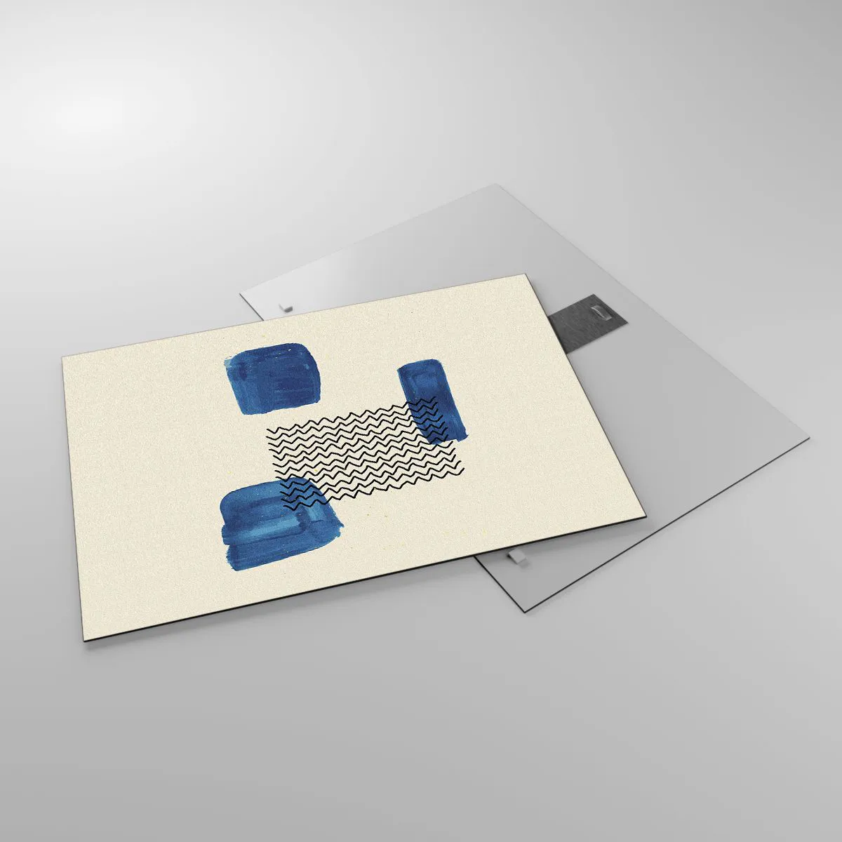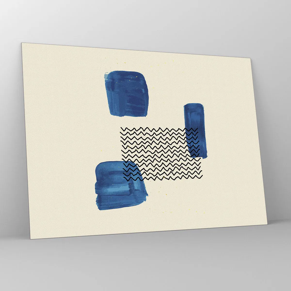 - Pictura pe sticlă înfățișează o abstracție modernă cu modele geometrice și accente albastre. Compoziția minimalistă și armonioasă aduce eleganță și o notă creativă interiorului.