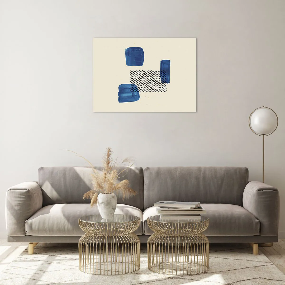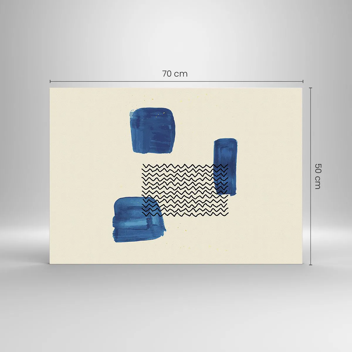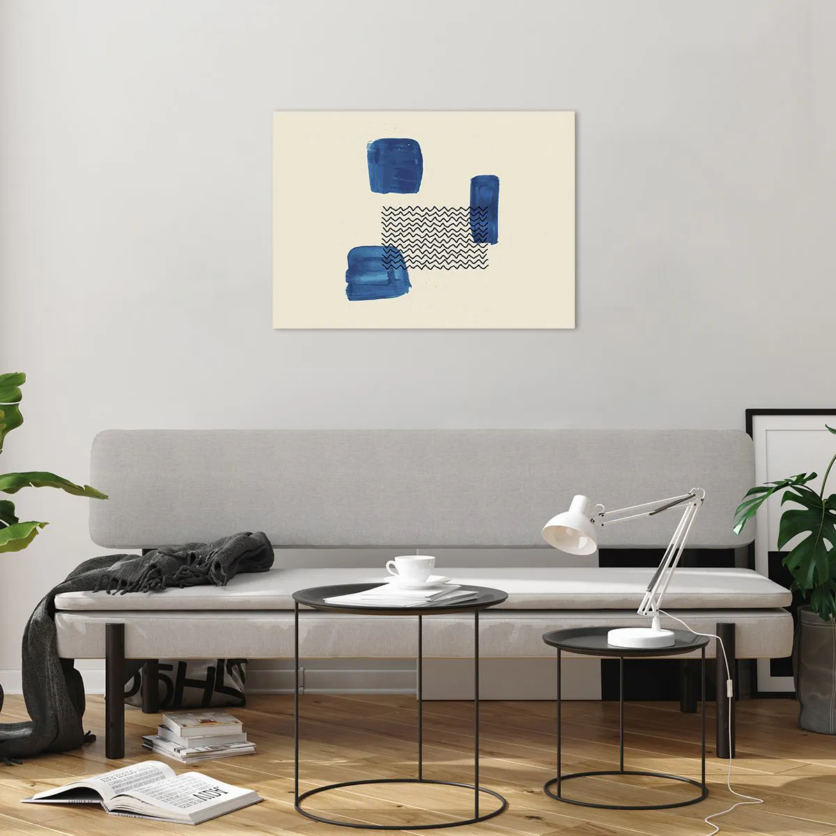 Abstracția, cu formele sale geometrice și accentul albastru izbitor, atrage privirea și conferă camerei un caracter dinamic, dar calm. Este o alegere excelentă pentru iubitorii de artă și iubitorii de compoziții artistice, moderne, care introduc o atmosferă creativă în interior.
