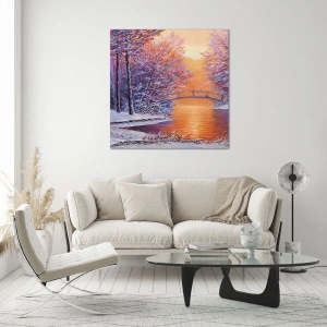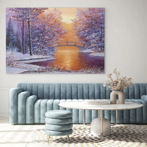 Tablou pe sticlă - Peisaj de iarnă cu un pod și copaci acoperiți de zăpadă la apus - 70x50cm - Hai să ne întâlnim aici - Decorațiune modernă pentru perete pentru living și dormitor ARTTOR