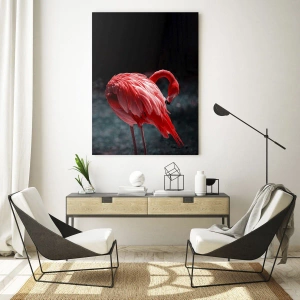 Tablou pe sticlă - Un flamingo în nuanțe intense de roșu pe un fundal închis - 70x50cm - Poemul purpuriu al naturii - Decorațiune modernă pentru perete pentru living și dormitor ARTTOR