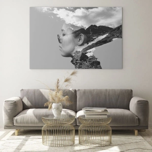Tablou pe sticlă - Un portret creativ cu dublă expunere, cu un peisaj montan și nori - 70x50cm - Portret în nori - Decorațiune modernă pentru perete pentru living și dormitor ARTTOR