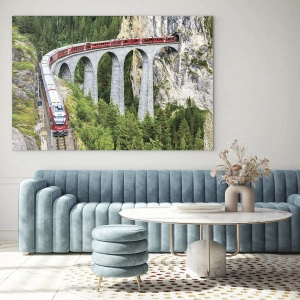 Tablou pe sticlă - Un tren cu un pod de munte în fundal printre peisaje verzi - 70x50cm - Cu trenul prin munți - Decorațiune modernă pentru perete pentru living și dormitor ARTTOR