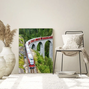 Un tren care trece peste un pod de munte pe fundalul unor peisaje frumoase și verzi este subiectul picturii „Calea ferată spre munți”. Podul din această imagine face parte dintr-o linie de cale ferată elvețiană, iar în fundal se pot vedea munți și păduri pitorești. Această operă de artă poartă privitorul într-o călătorie prin trasee montane, arătând frumusețea naturii și priveliști de neuitat. Trenul în vagoanele sale roșii se ridică deasupra văii, creând un contrast minunat cu vârfurile abrupte.