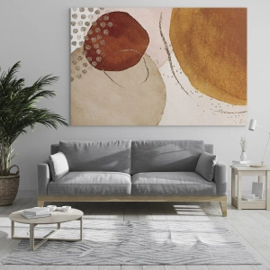 - Pictura prezintă cercuri abstracte în nuanțe de bej, maro și auriu, creând o compoziție armonioasă și elegantă. Culorile și formele delicate conferă piesei un caracter cald și modern.