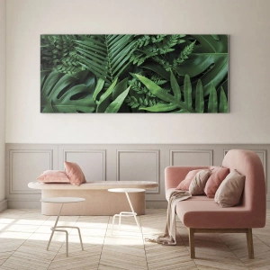 Tablou pe sticlă - Frunze verzi dense de plante tropicale în compoziție - 70x50cm - Înfășurate în verde - Decorațiune modernă pentru perete pentru living și dormitor ARTTOR