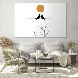 Tablou pe sticlă - Păsări pe o linie sub un soare portocaliu - 70x50cm - Seară cu privighetori - Decorațiune modernă pentru perete pentru living și dormitor ARTTOR