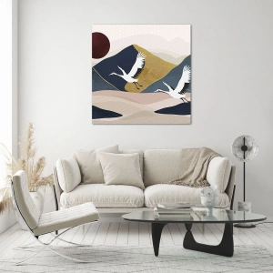 - Un peisaj stilizat cu două cocori în zbor, înconjurat de peisaje muntoase și un soare roșu. Inspirată de estetica orientală, această compoziție minimalistă și liniștită evocă armonie și echilibru.