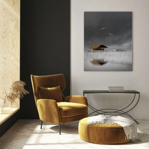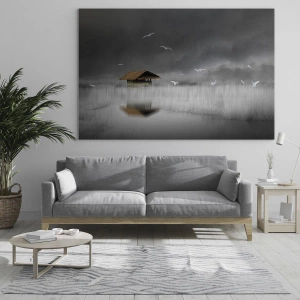 - Un peisaj sumbru cu o casă de lemn pe apă, învăluită în ceață. Păsările se înalță în fundal, creând o scenă atmosferică și liniștitoare, perfectă pentru decorarea spațiilor de relaxare.