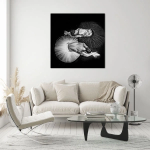 Tablou pe sticlă „Yin și Yang - Echilibru perfect” este o fotografie profund simbolică în care dansul devine o metaforă pentru armonie și echilibru. Pe un fundal întunecat, două balerine în costume contrastante - tutu-uri albe și negre - se odihnesc într-o poză identică, creând un semn vizual de yin-yang. Fotografia emană pace, concentrare și un contrast perfect de forme și culori.