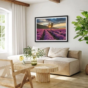 - Acest poster înfățișează un câmp de lavandă cu un copac solitar pe fundalul unui apus de soare. Nuanțele delicate de violet ale florilor contrastează cu lumina caldă a soarelui. Perfect pentru interioare pline de armonie și liniște.