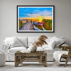 Poster în ramă neagră - O barcă pe un lac la apus, cu păsări în fundal - 50x70cm - La revedere, până mâine - Decorațiune modernă pentru perete pentru living și dormitor ARTTOR