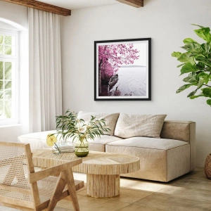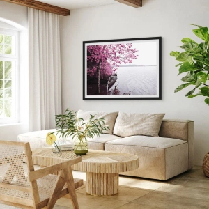 Poster în ramă neagră - O barcă pe malul unui lac sub un copac în frunze înflorite - 50x70cm - În tăcerea roz - Decorațiune modernă pentru perete pentru living și dormitor ARTTOR