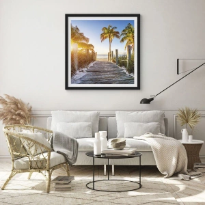 Poster în ramă neagră - Cale de lemn spre plajă cu palmieri în lumina soarelui - 50x70cm - Direct în paradis - Decorațiune modernă pentru perete pentru living și dormitor ARTTOR