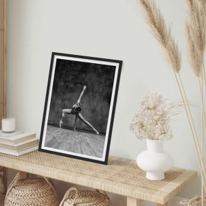 Poster în ramă neagră - O balerină alb-negru într-o poză dinamică pe un perete brut. - 50x70cm - Idealul de echilibru - Decorațiune modernă pentru perete pentru living și dormitor ARTTOR