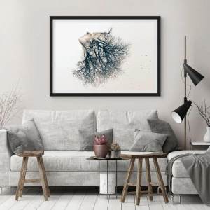 Poster în ramă neagră - Fața unei femei cu crengi care formează părul într-un stil suprarealist. - 50x70cm - Ascultând șoapta copacului - Decorațiune modernă pentru perete pentru living și dormitor ARTTOR