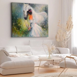 Tablou pe pânză Canvas - O femeie cu un cal alb într-un cadru pitoresc - 70x50cm - Ca dintr-un vis frumos - Decorațiune modernă pentru perete pentru living și dormitor ARTTOR