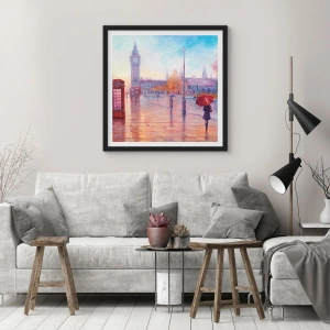 - Acest poster înfățișează repere emblematice londoneze - Big Ben și o cabină telefonică roșie - într-o zi ploioasă. Nuanțele pastelate subtile și atmosfera romantică adaugă eleganță oricărui interior.