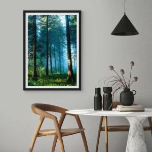 Poster în ramă neagră - Pădure de conifere în soarele dimineții și ceață ușoară - 50x70cm - Strălucirea de dimineață - Decorațiune modernă pentru perete pentru living și dormitor ARTTOR