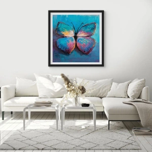 Poster în ramă neagră - Un fluture în culori intense pe un fundal albastru - 50x70cm - În plină glorie - Decorațiune modernă pentru perete pentru living și dormitor ARTTOR