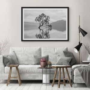 - Acest poster alb-negru înfățișează un copac solitar reflectat în apa liniștită. O compoziție subtilă, plină de armonie și eleganță.