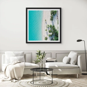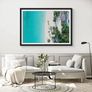 Poster în ramă neagră - Vedere aeriană a unei plaje tropicale cu palmieri și mare albastră - 50x70cm - Vacanță în paradis - Decorațiune modernă pentru perete pentru living și dormitor ARTTOR