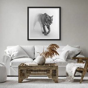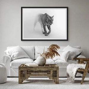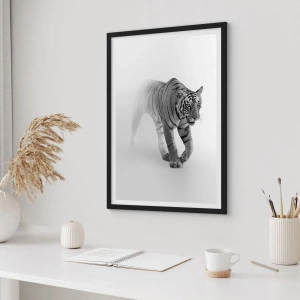 Poster în ramă neagră - Un tigru alb-negru ieșind din ceață - 50x70cm - De veghe în ceață - Decorațiune modernă pentru perete pentru living și dormitor ARTTOR