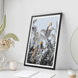 Poster în ramă neagră - Animale tropicale colorate printre frunzele junglei - 50x70cm - O fabulă africană - Decorațiune modernă pentru perete pentru living și dormitor ARTTOR