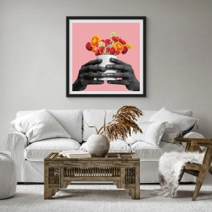 Poster în ramă neagră - Mâini negre care țin un buchet de flori pe un fundal roz - 50x70cm - Apoteoza vieții - Decorațiune modernă pentru perete pentru living și dormitor ARTTOR