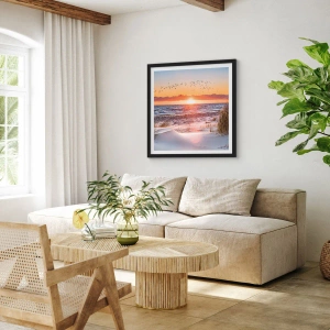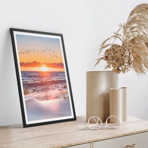- Acest poster înfățișează un apus de soare peste o mare calmă, cu păsări la orizont și o plajă cu nisip în fundal. Culorile calde și peisajul natural creează o armonie unică. O decorațiune perfectă pentru interioare inspirate de natură.