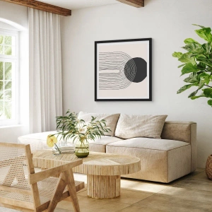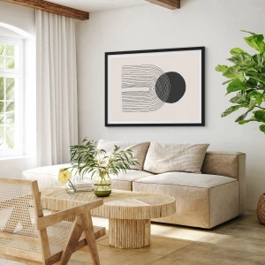 - Un poster minimalist cu un motiv geometric alb-negru care înfățișează cercuri și linii. Perfect pentru decorarea interioarelor moderne. Include o ramă neagră de 50x70 cm.
