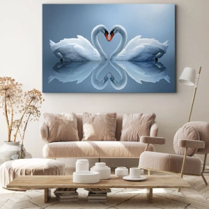 Tablou pe pânză Canvas - Două lebede formând o inimă pe o suprafață calmă a apei - 70x50cm - Timp pentru dragoste - Decorațiune modernă pentru perete pentru living și dormitor ARTTOR