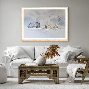 - Acest poster înfățișează un peisaj pitoresc de iarnă, cu o căsuță și un car cu fân pe fundalul unui munte. Nuanțele pastelate subtile și peisajul liniștit creează o atmosferă unică de armonie.